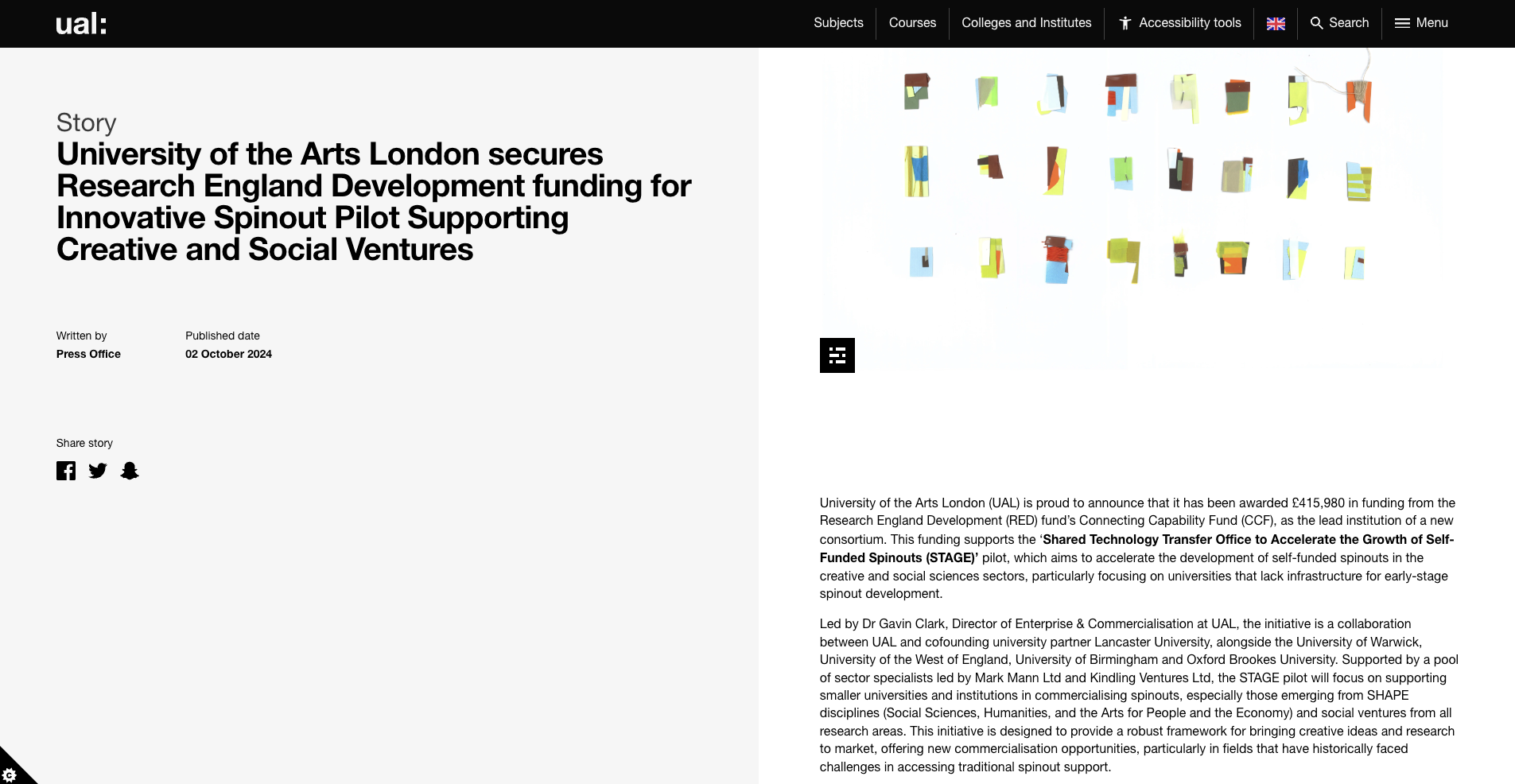 In 2025 we entered into a new dedicated phase within Gavin Clarkes Shared TTO programme. Between UAL and cofounding university partner Lancaster University, alongside the University of Warwick, University of the West of England, University of Birmingham and Oxford Brookes University. Supported by a pool of sector specialists led by Mark Mann Ltd and Kindling Ventures Ltd, the STAGE pilot will focus on supporting smaller universities and institutions in commercialising spinouts, especially those emerging from SHAPE disciplines (Social Sciences, Humanities, and the Arts for People and the Economy) and social ventures from all research areas.